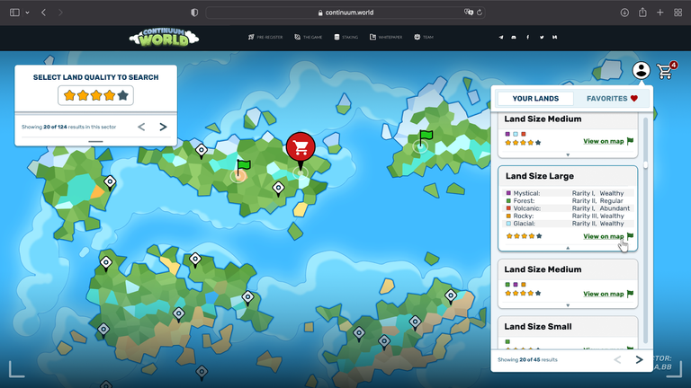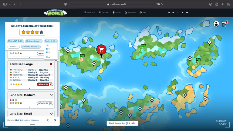 Além de mostrar os detalhes da terra que você escolheu, se você preferir procurar por um tipo específico de terra nesse mesmo mapa... é nesse menu que você deve procurar! Aqui vamos ter filtros por qualidade (estrelas), preço, tamanho, bioma, raridade e abundância... seja exigente o quanto quiser!
